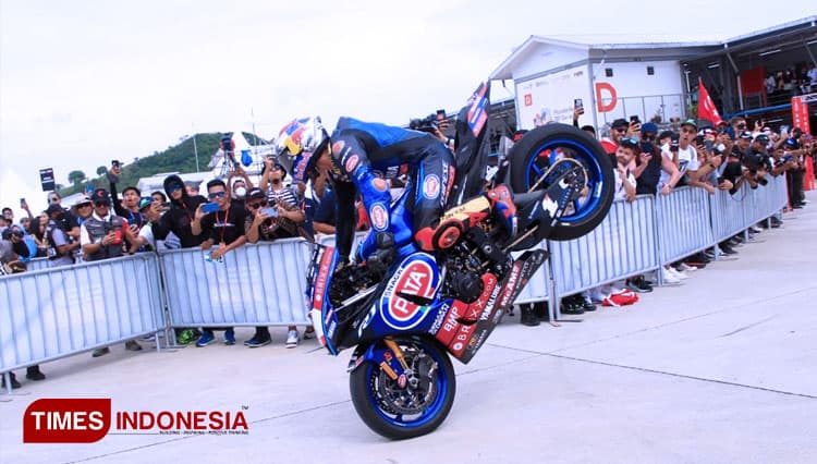 TIMES Sukabumi/Pembalap PATA Yamaha Brixx Toprak Razgatlioglu melakukan atraksi stopie ban depan usai memenangi race 1 WSBK Mandalika 2022, Sabtu (12/11/2022). (FOTO: Tria Adha/TIMES Indonesia).